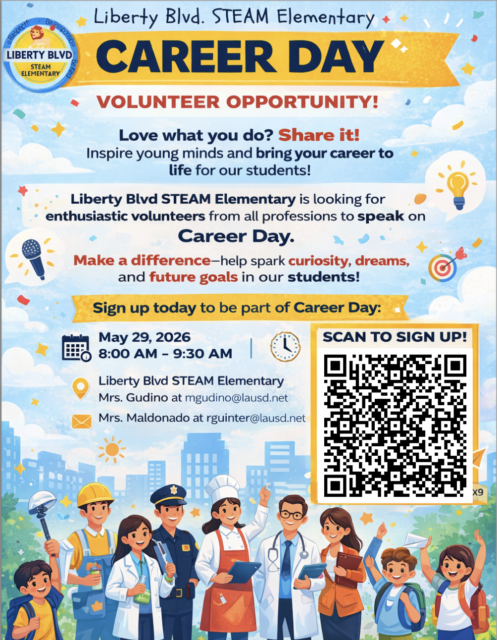 Liberty Blvd STEAM Elementary is looking for enthusiastic volunteers from all professions to speak on Career Day.